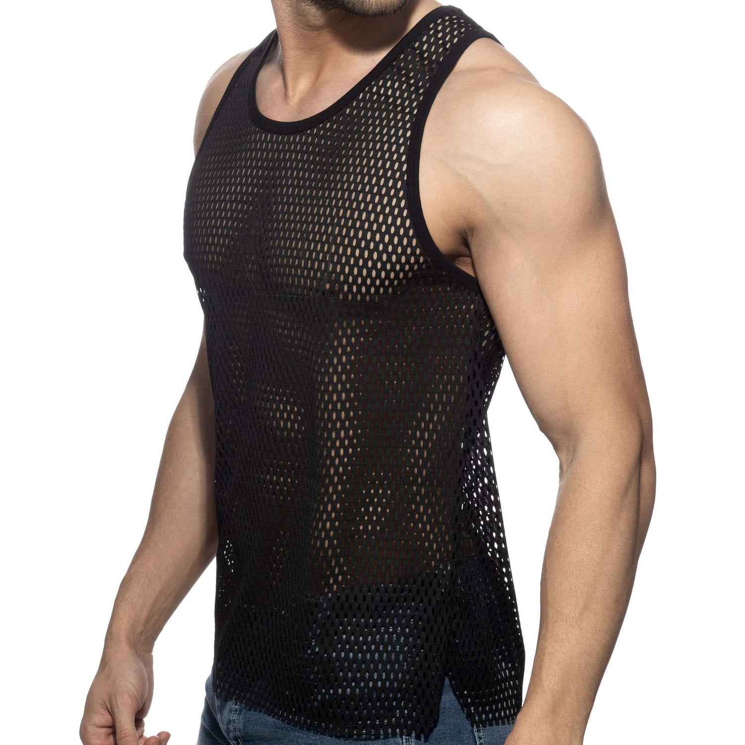 Sporty, sexy tank top made from open mesh for total transparency. Lightweight, breathable fabric. Fitted cut and round collar. Tone-on-tone AD logo on chest.